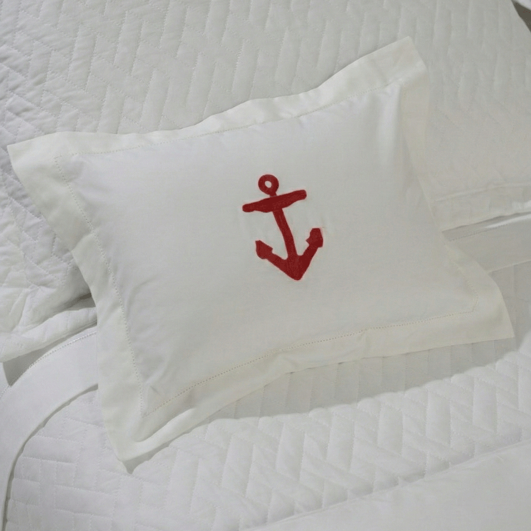 Produto confeccionado em algodão 320 fios com bordado de âncora para trazer o tema náutico para a decoração. O detalhe em ajour nas laterais traz toque de delicadeza à capa de almofada.
